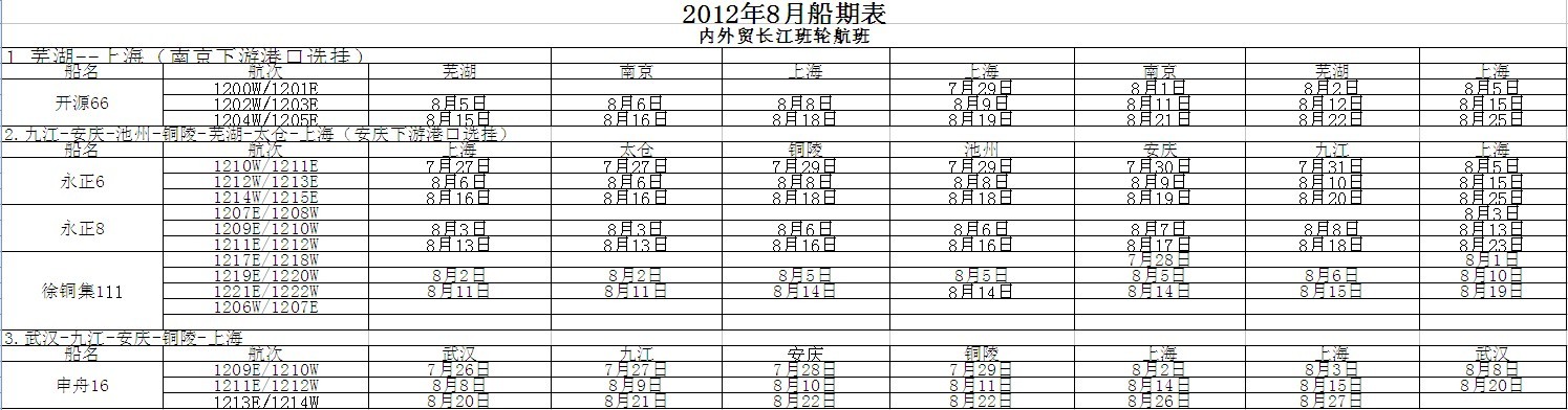 上海申舟船务8月份船期表