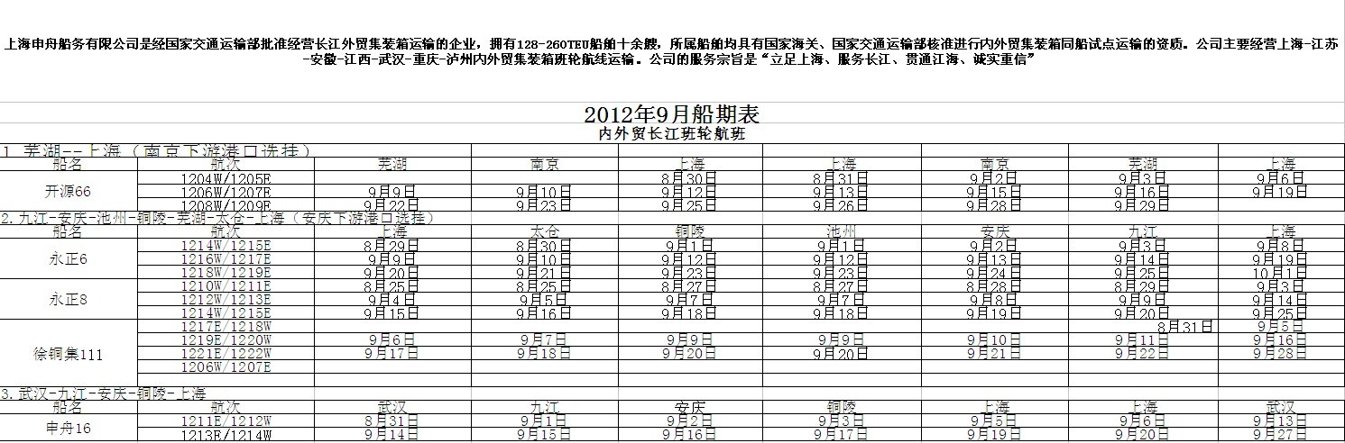 上海申舟船务9月份船期表